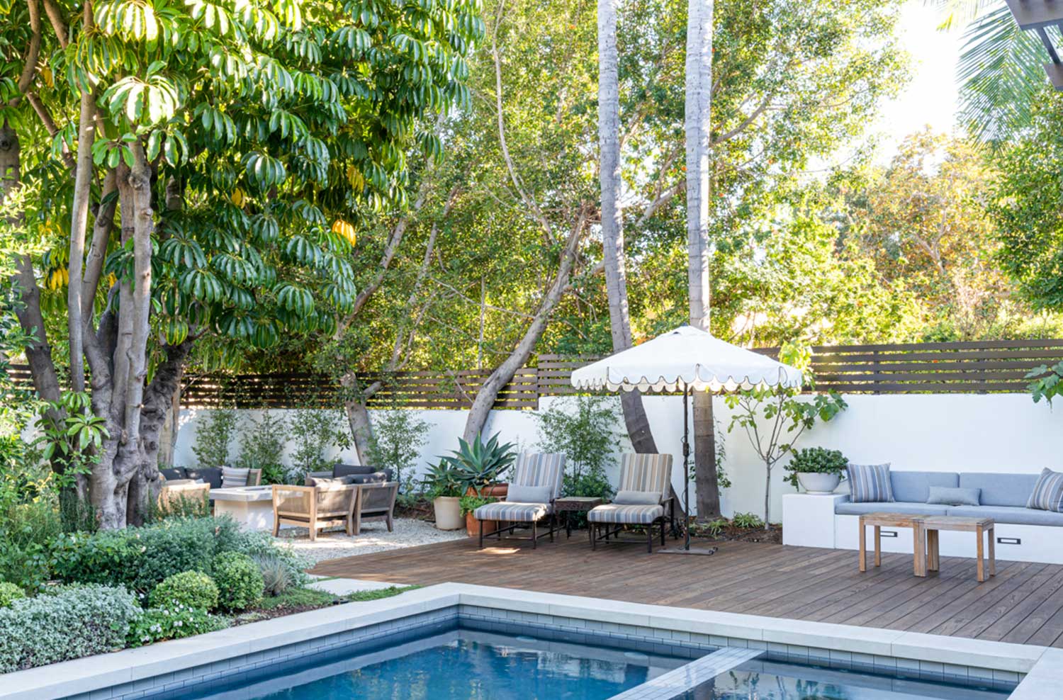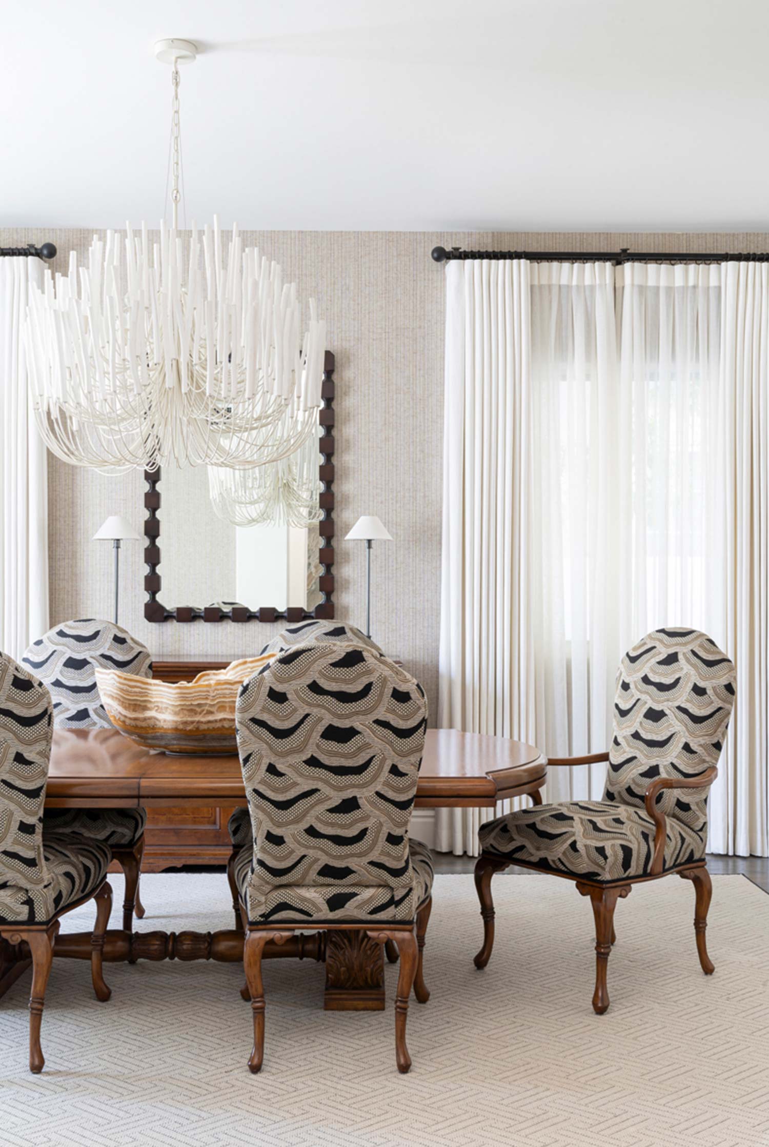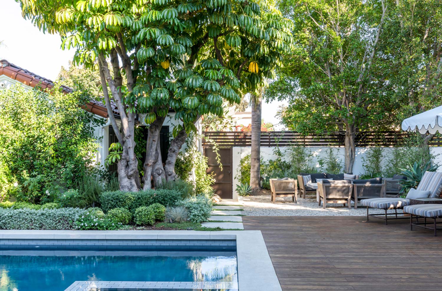 970-401-0543Located in the heart of Beverly Hills, this spanish style home was ripe for a remodel. We worked with the owners to create a modernized version of their dream home, with a whole new color scheme inside and out. The custom kitchen has a large center island topped with high contrast quartz slabs that can also accommodate bar seating at one end of the island for a more modern look. A wall to wall dining banquette and custom table to fit their large family was built under the window. We’re told this kitchen is now the heart of the home, the main gathering place due to the extra seating we created with the oversize banquette versus the small dining table they originally had placed in that space. In the family room, we designed a custom bar cabinet and wall shelves which flanked the fireplace slab we sourced to update the space. We reconfigured the furnishings to allow for maximum entertainment appeal and an elevated comfort. In the dining room, we reinvented the clients heirloom chairs by recovering them in a wow-factor fabric providing a much needed visual punch. We also used a fabric wall covering on the walls and highlighted the large windows with bright and airy belgium linen for a more updated look. The oversized chandelier is the statement piece that pairs well with the vintage pieces and pulls focus in a good way! The backyard pool was rebuilt to be made smaller and allow for various seating and gathering spaces. Our favorite part of the outdoor space is the use of varying ground materials - from pea gravel to decking to white colored concrete- to add to the natural texture of the beautiful greenery and palm trees. The home now feels like an oasis to the busy city life just outside.